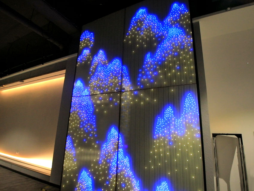 隨著LED光源亮度的強弱變化,山峰隱約閃現(xiàn),遠近高低各有不同韻味。在光線稍暗的場合中,LED光源組成的圖形更為耀眼矚目。
