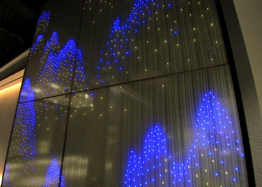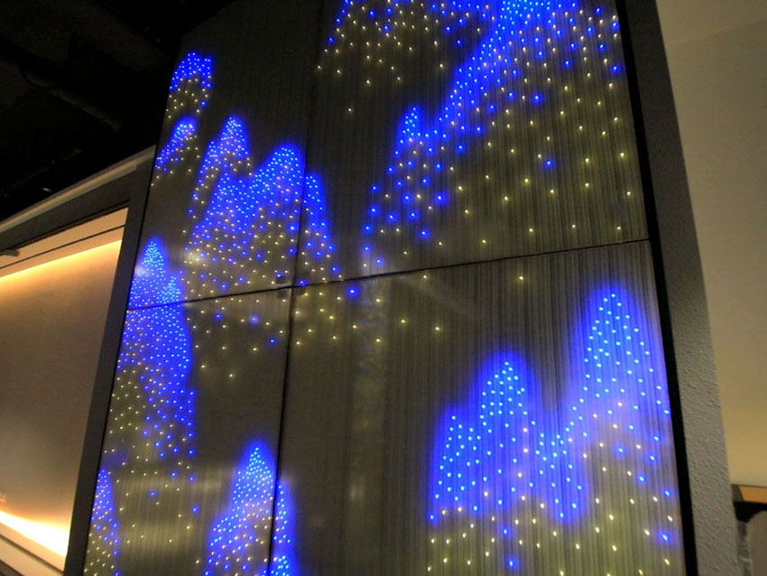構(gòu)筑空間的美感,營造獨特的空間魅力,高密度的點點LED光源,通過不同燈光顏色的組合,在玻璃上鑲嵌出了一幅山峰高低起伏的圖畫。原本平面的玻璃背景墻,呈現(xiàn)出立體的觀感。