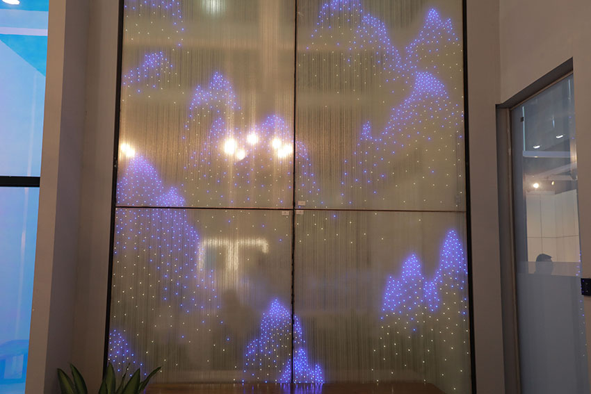該玻璃以藝術(shù)玻璃為基礎(chǔ),與LED燈珠、導(dǎo)電膜、EVA等經(jīng)特殊工藝夾合制成。4片玻璃里面點綴了上千顆LED燈珠。LED燈珠不發(fā)光時,它就是一款普通的夾絲玻璃。