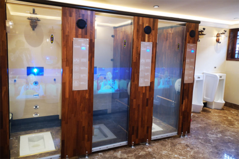 首先,讓人感觸最深的就是廁所的玻璃門,許多不了解的游客都看傻了眼,紛紛感嘆:要不要這么開放?透明的門怎么方便???其實,這是連接了感應控制系統的調光玻璃門。沒有人在里面的時候,玻璃門呈透明狀態,讓人一眼就能看到有空位;當有人進入廁所關上門后,玻璃門就會由透明瞬間轉換為不透明的霧化狀態,里面和外面都互相看不見,但玻璃的透光性良好,在里面的人不會感覺黑暗。